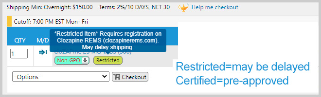 When viewing Clozapine items in your cart you will now see two new cart "flags". These buttons indicate if you are pre-approved "Certified" or "Restricted" and may experience shipping delays. Even restricted you can order but the wholesaler will need to register your pharmacy with the Clozapine REMS program prior to shipping. Hovering over the button in your cart shows additional detail (see image).
